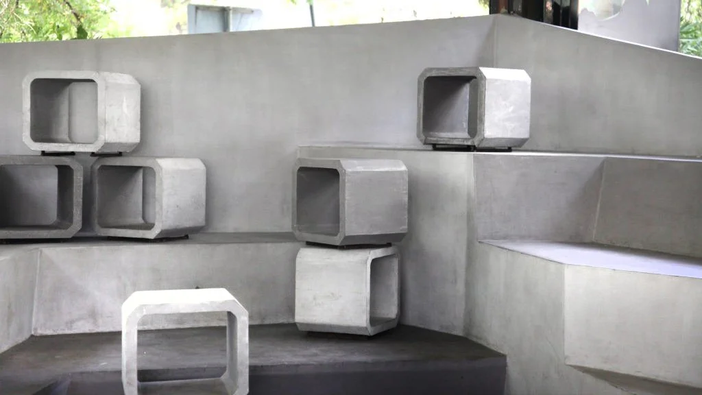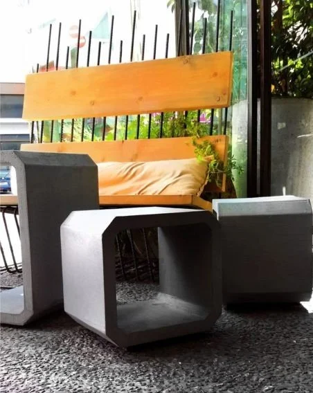 Concrete adds plasticity to the forms, while framing lumber completes the composition. The modular nature of the furniture enables ever-changing arrangements, offering users different spatial experiences.
