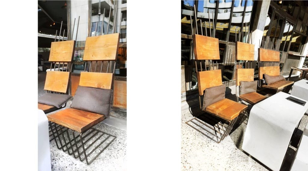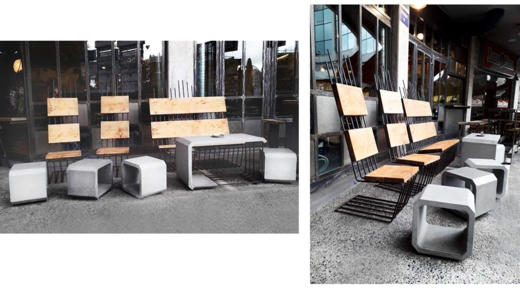 Οι ράβδοι οπλισμού (tmt bars), βασικό στοιχείο της αρθρωτής δομής, παραμένουν εμφανείς, εξασφαλίζοντας απλότητα και σταθερότητα. Το σκυρόδεμα προσδίδει πλαστικότητα στις μορφές, ενώ η ξυλεία καλουπιών ολοκληρώνει τη σύνθεση. Ο αρθρωτός χαρακτήρας του επίπλου επιτρέπει διαρκώς νέες συνθέσεις, δημιουργώντας διαφορετικές εμπειρίες για τους χρήστες.